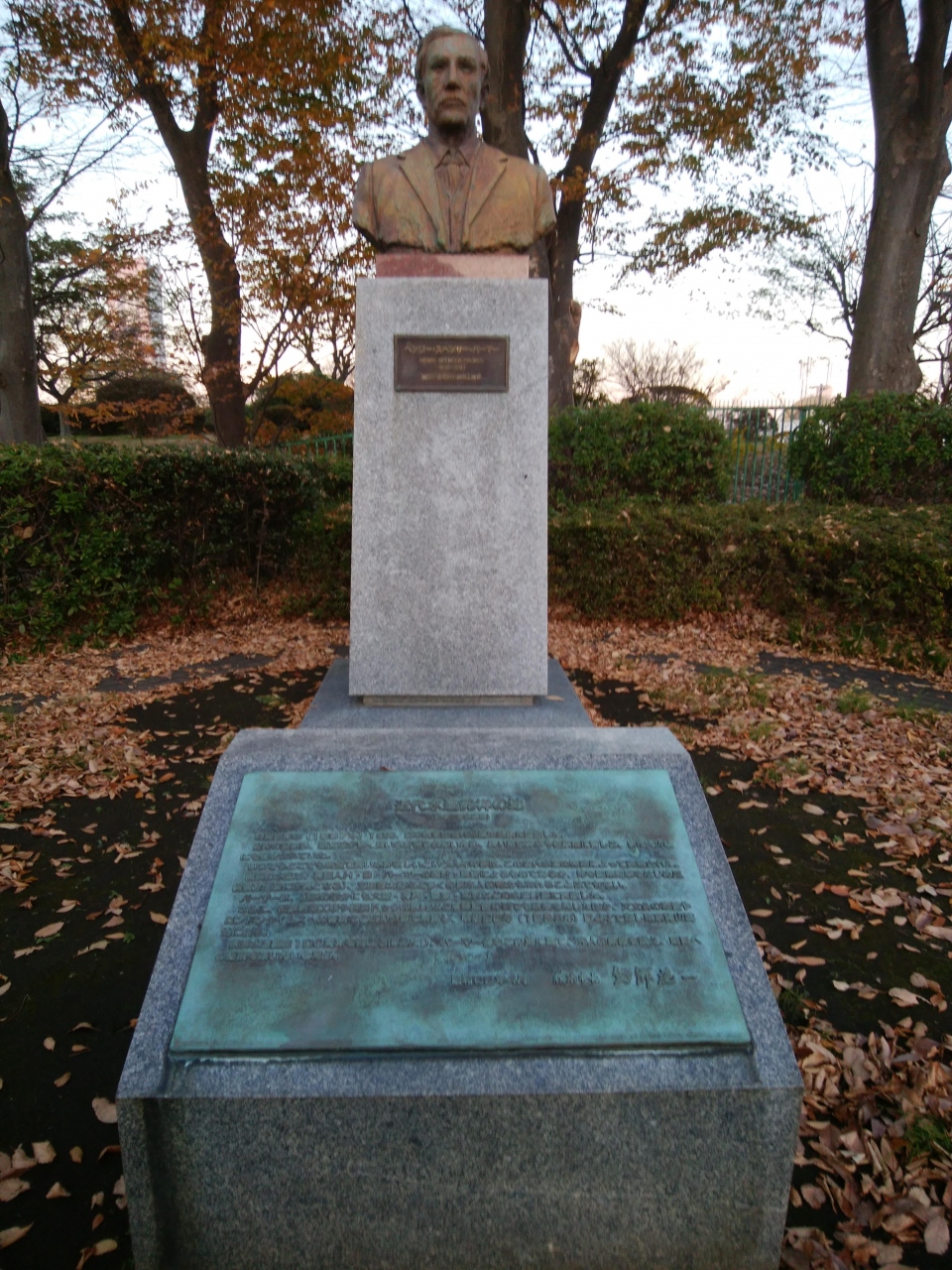 12月の休日、紅葉に映える近代水道発祥の父と言われる野毛山公園内のヘンリー像を訪問。赤く染まった夕暮れの公園は寂寥の感があるが、そこから太陽を見つめる像からは、はるか明治時代の偉業を成し遂げた偉大さを感じた。