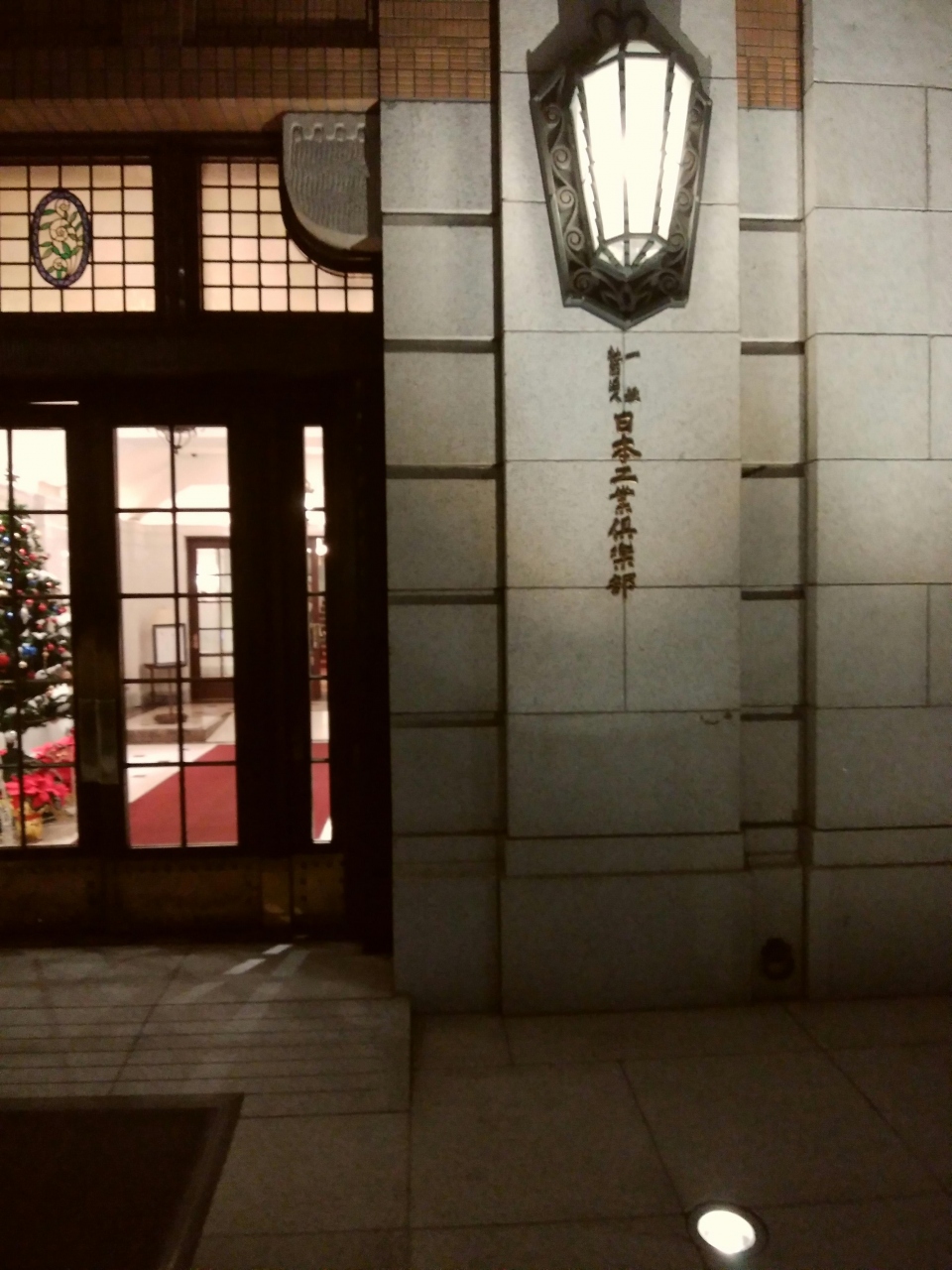 丸の内のイルミネーションを見て、東京駅に向かう途中に重厚な玄関である日本工業倶楽部会館があった。クリスマス前の華やかな夜景が広がる丸の内で夜でも明かりが煌々と灯される建物は界隈が日本の中心であることを感じさせた。