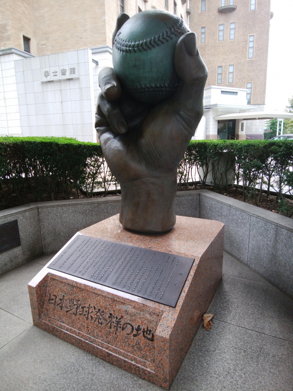 竹橋駅から神田古書街へ行く途中、東京大学発祥の地である学士会館の敷地内には日本野球発祥の碑があった。はじめて野球が運動場で開始されたのがここであり、日米野球も行われていたという。白山通り沿いには学問の地らしく発祥の地が多いようである。