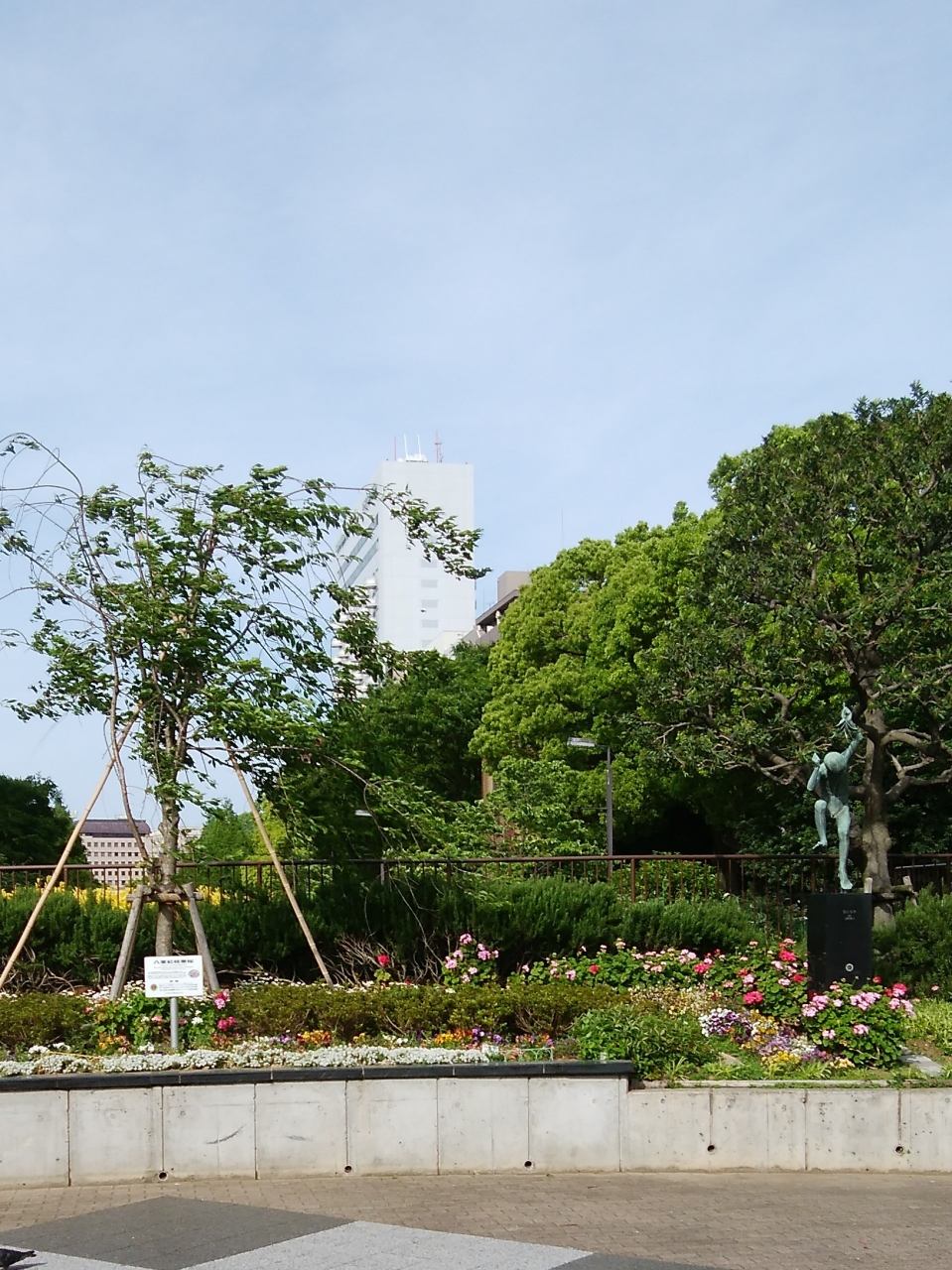 神明社に参拝し横にあるビジネスパークで休息。もとは硝子工場の跡地で再開発したビルは、25年も経つものの最近のビルより余裕ある建築をしており、色あせていなかった。野村総研を中心とした野村グループが入居しているようである。