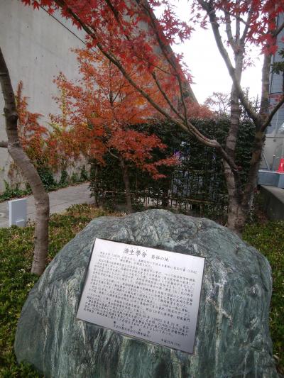 師走の御茶ノ水を散歩、薬局の裏にある小栗上野介屋敷跡を眺めました。この辺りは江戸時代の幕臣の屋敷跡が多いですが、表示があるのみで、屋敷跡はYWCAビルになっていました。小雨降る地を後にして駅への坂を上がりました。