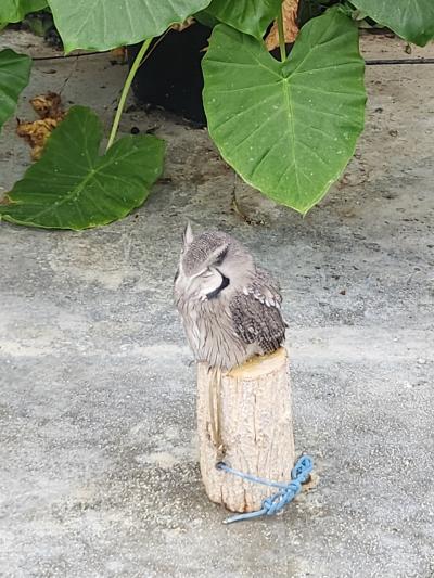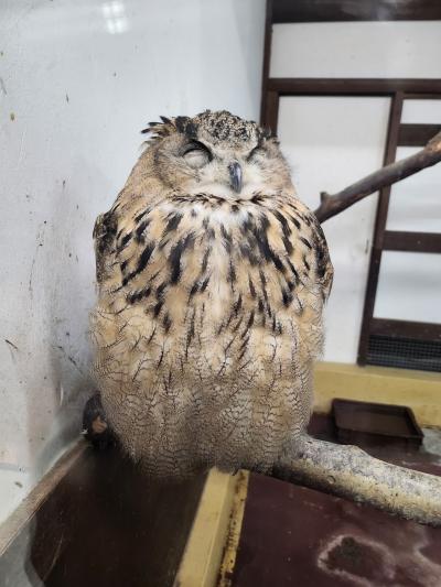 温室内にもフクロウがいました。やっぱり寝てる…暖かいしね。