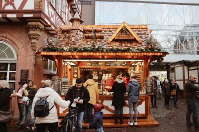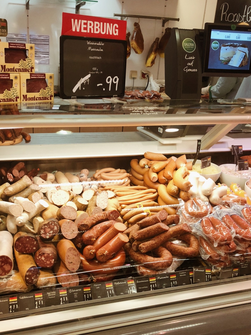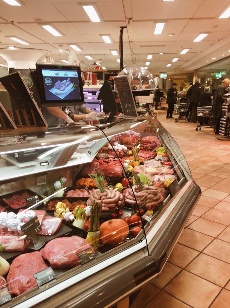 フランクフルトの中でも大きなデパートで、ファッションや化粧品、リモワなどの鞄のお店も入っていて充実しています。地下にはチョコレートやバームクーヘンなどのお菓子系のお土産や、調味料、ソーセージやキッシュ、チーズ、出来合いのお惣菜など、ドイツの美味しいものが沢山並んでいます。日本のデパ地下グルメのドイツバージョンといった感じでした。