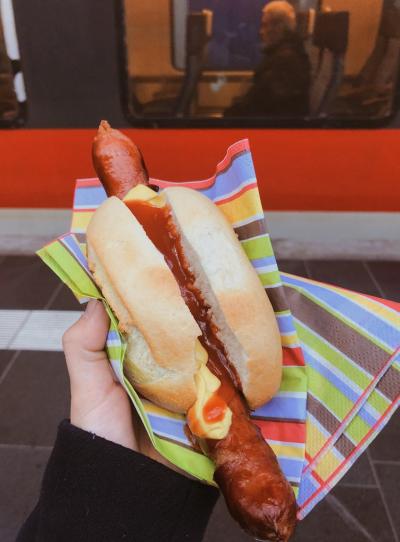 フランクフルト中央駅にあり、夜は22時まで、日曜日も開いているので、フランクフルトに着いた日の夜食と、出発日の朝食はここで済ませました。牛と豚の二種類のソーセージや、レバーケーゼなどをパンに挟んでくれて、テイクアウトも出来ます。駅で列車の出発を待ちながら手軽に食べる分には十分です。他にもサンドイッチやプレッツェル、ハーゲンダッツの店など色々ありました。