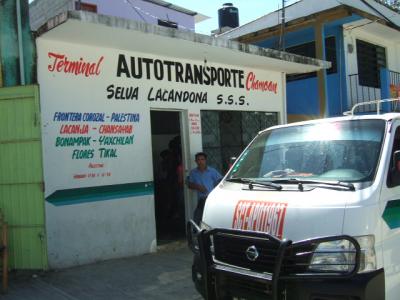 ※メキシコ国境Corozal←→Palenque間はChamoan社の路線バス(ミニバス)が基本的に毎時1本(Palenque発05:00~17:00、Corozal発04:00~16:00)運行しており、ツアー客に合わせて台数が増発(3台に分乗)されていました。歩き方には「乗り継ぎ」「危険」との記載がありますが、実際には個人で乗っても同じことだと思います(写真はPalenque市内の同社Office前)。