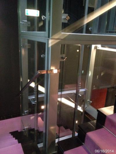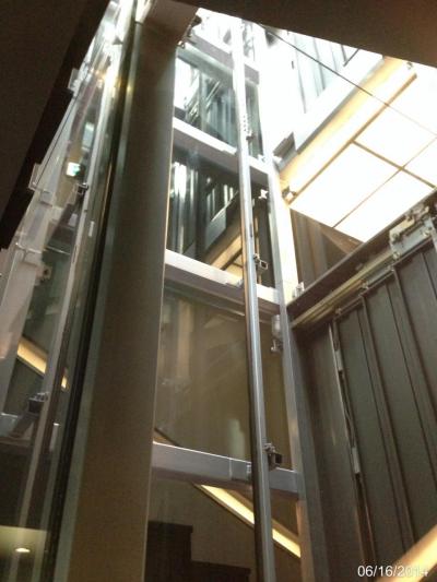 館内のエレベータ。建物の中庭の空間を利用したシースルーエレベータ。