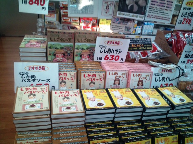 特に害獣駆除にて猟友会の方々が取ったいのししや鹿の加工品がずらりと並んでおります