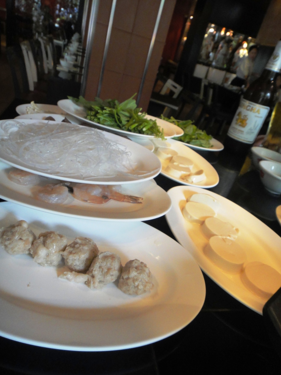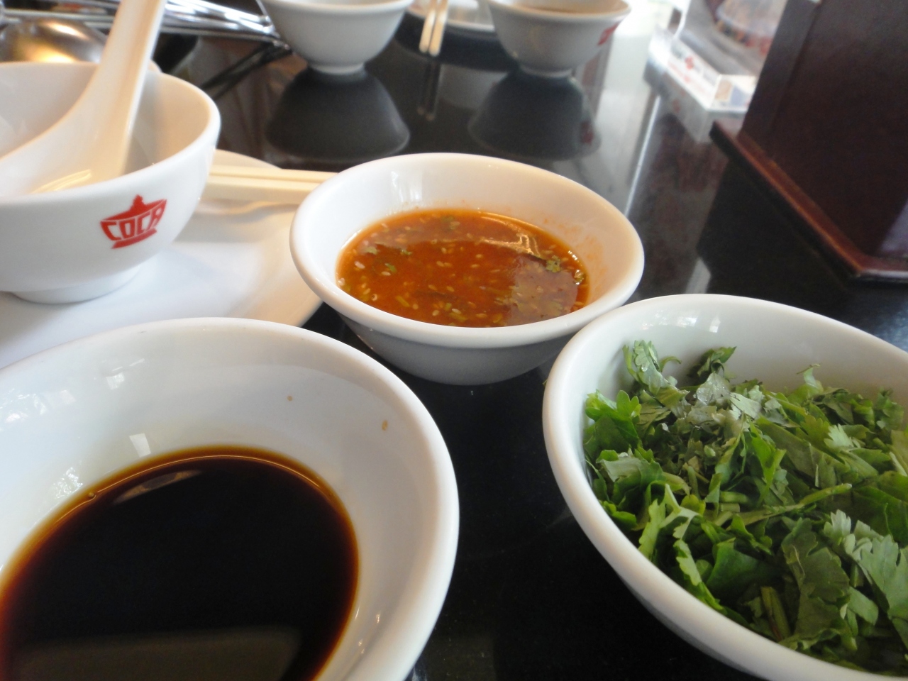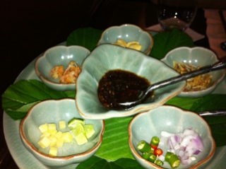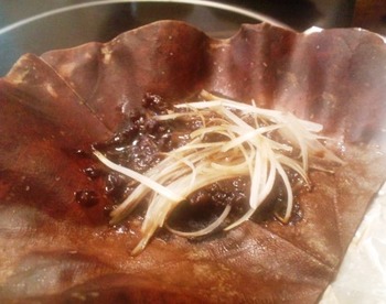 干し海老やナッツ、生姜、唐辛子等を乗せて中央のソースをかけ葉ごと頂きます