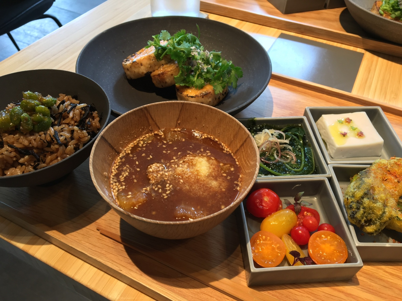 肉や魚を使っていない (ヴィーガン?) 精進料理風。焼きなすと生姜の赤出汁やひじき玄米ご飯など。
