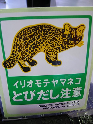 西表島・上原港の売店で「イリオモテヤマネコ 飛び出し注意」の標識のステッカーをお土産に購入してみました。