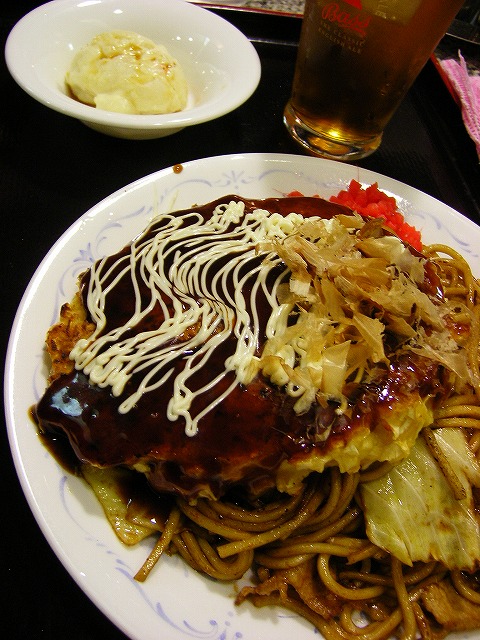 私はお好み焼き屋さんの「銀杏屋」でモーニングセットC、420円をいただきました。お好み焼きと焼きそば、ポテトサラダとウーロン茶のセットです。