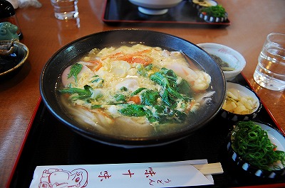 鶏肉とかまぼこ、野菜を卵でとじたものが乗っている温かいおうどんで、やさしい味で美味しかったです。
