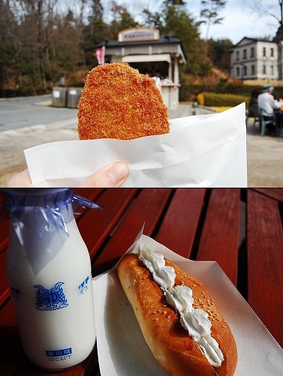 「たっぷりのあずきあんとホイップクリームをドッグロールパンにはさみこんだ、ほんのり香ばしい明治村ならではの名物、小倉ドッグ」(牛乳とセットで330円)