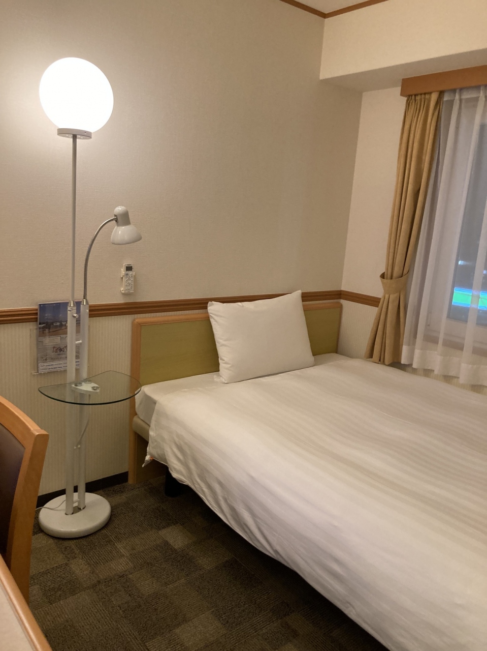 ベッドは大きめで、横にライトと小さなテーブルがありました。