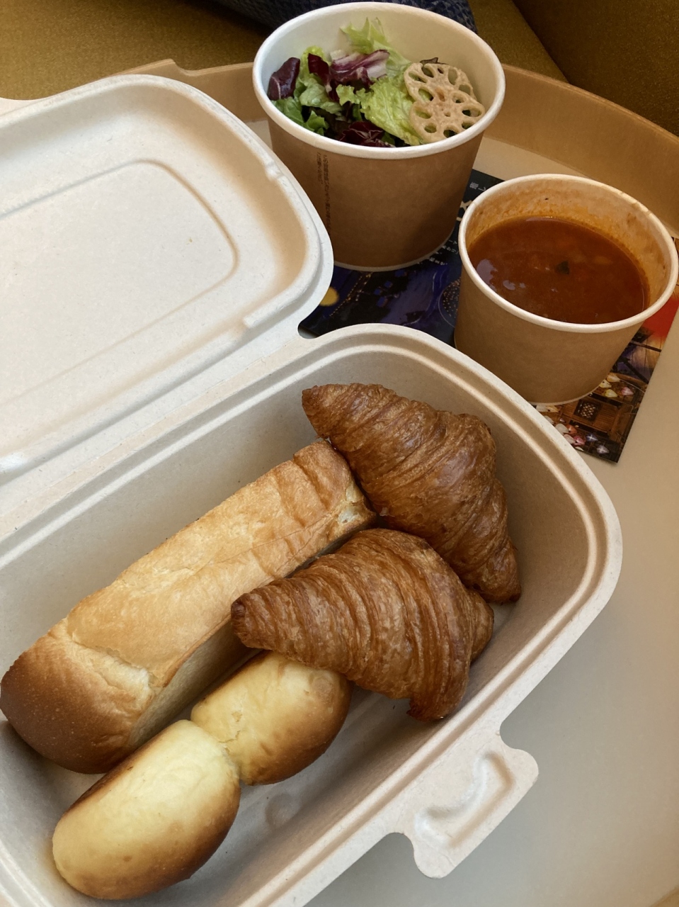 サラダ、スープ、ドリンクのジュースは珍しいものばかり^ ^エコで紙素材で提供。