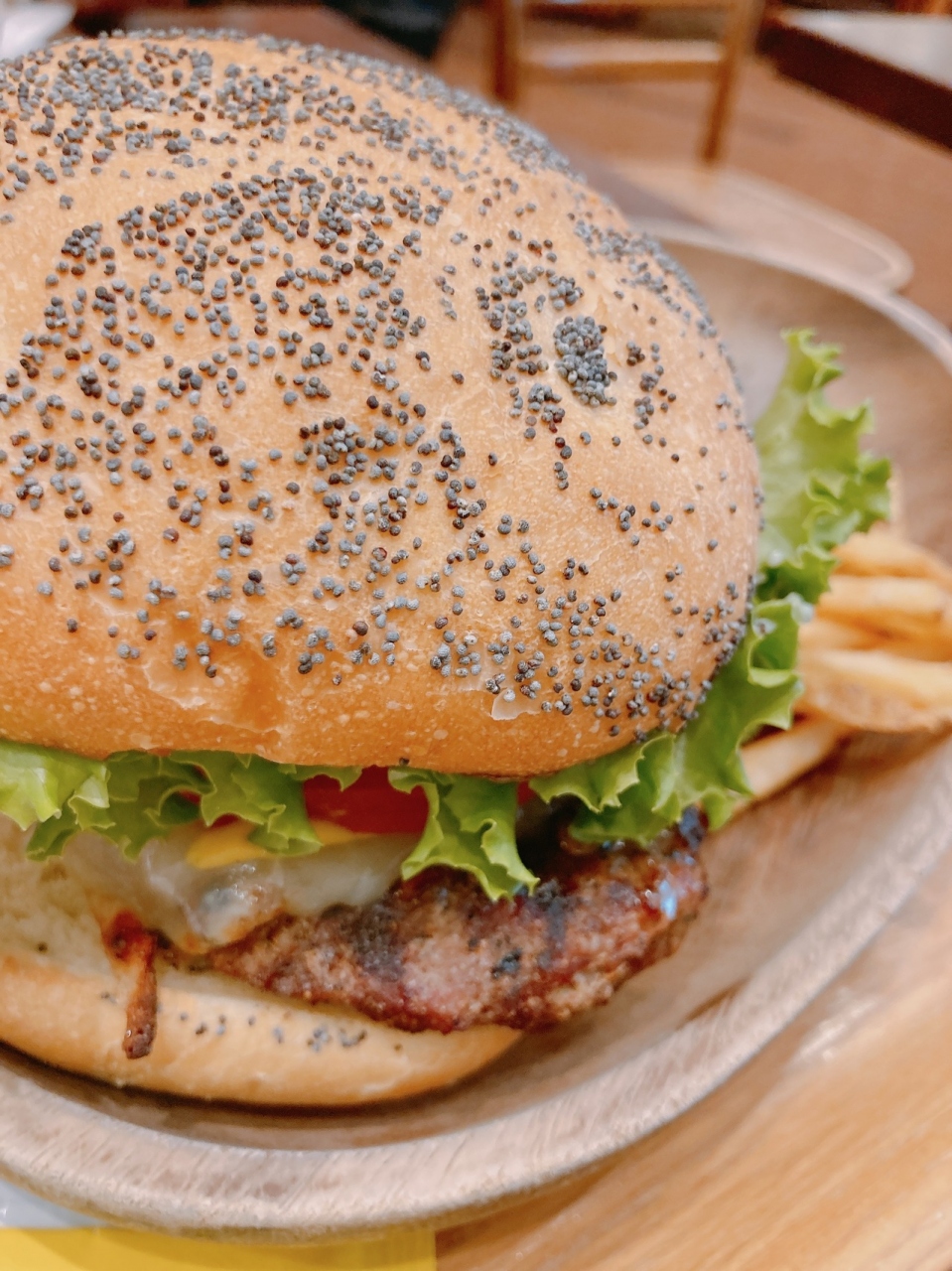 大きなハンバーガーです。パンの種類が選べる。カイザーロールかブリオッシュ。チーズも3種類から選べます。