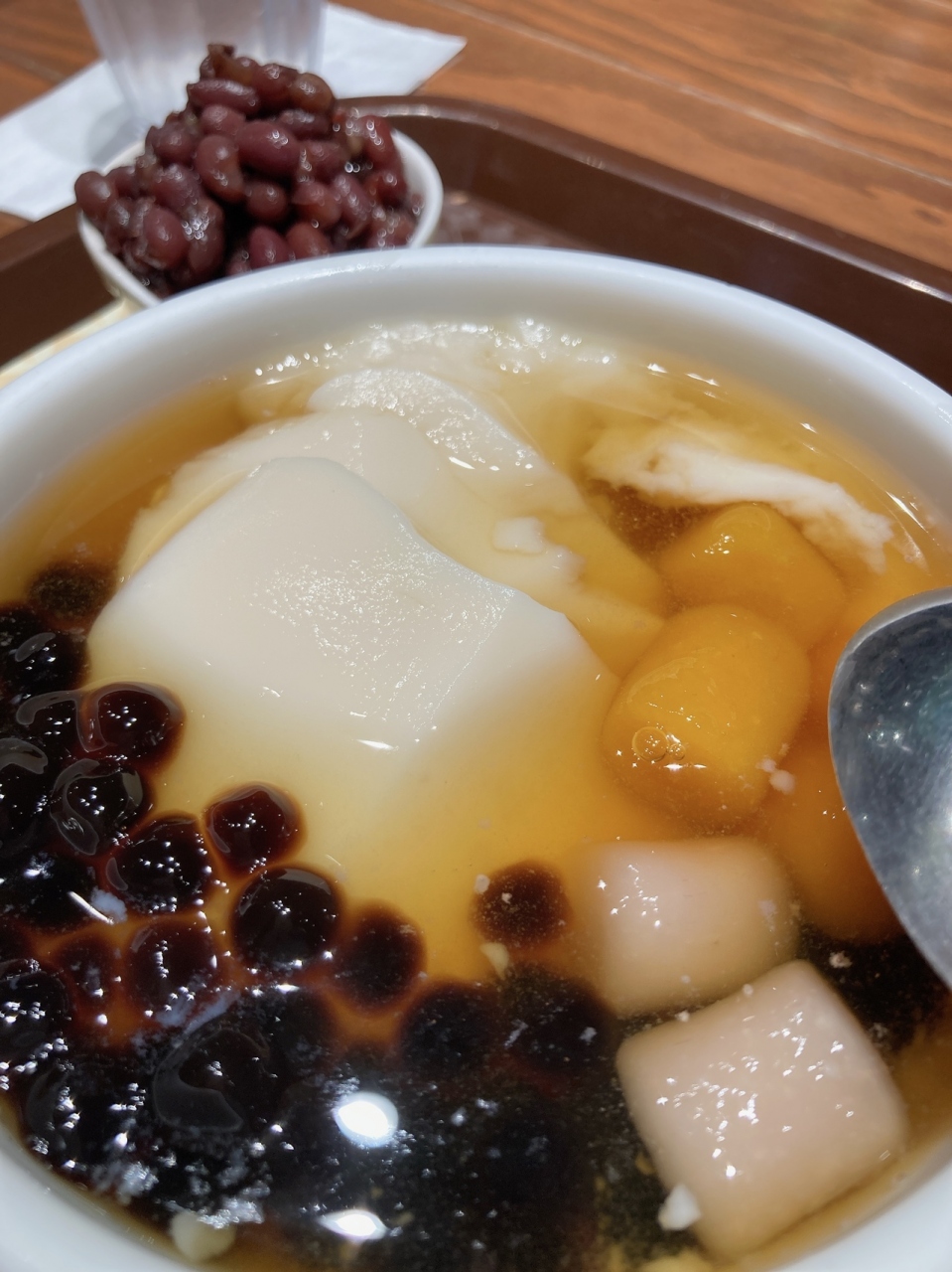 私は、全部盛りの温かい豆花に小豆をトッピング注文!