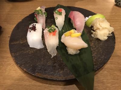 仕事を終え三宮駅に戻ってきて少し早めの夕食タイムとしました。カマ焼き、白子ポン酢、あん肝などでビール、地酒を飲んだ後にお寿司をいただきました。ネタが大きいのが売りなのでしょうか。どの握りもシャリを覆いかぶせていました。地酒を飲みすぎましたが無事予定の新幹線に乗車できました。