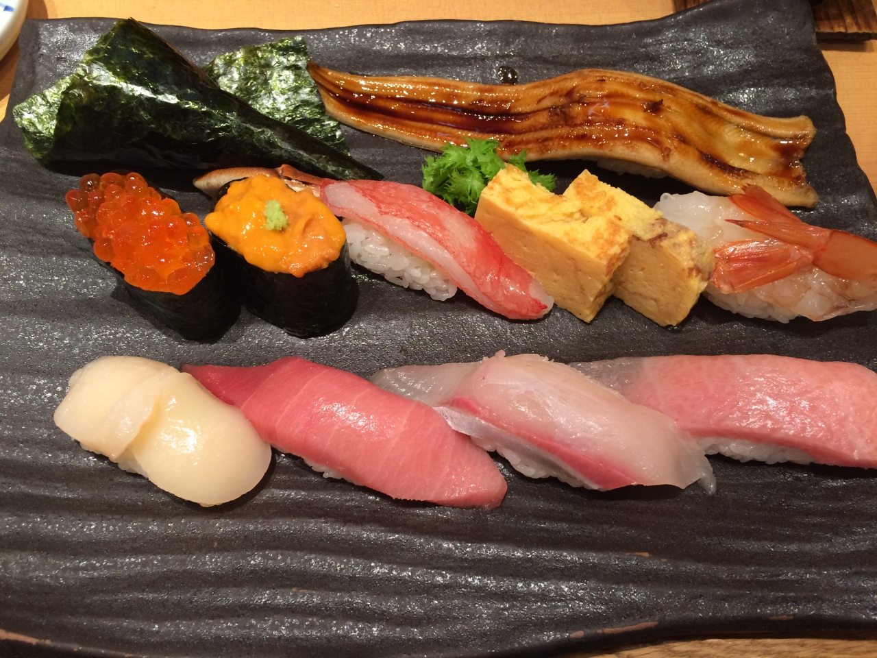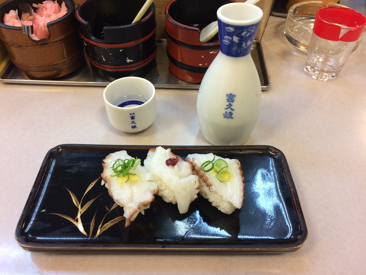 寿司屋さんのカウンターでさば・生たこ・穴子に熱燗をいただき、