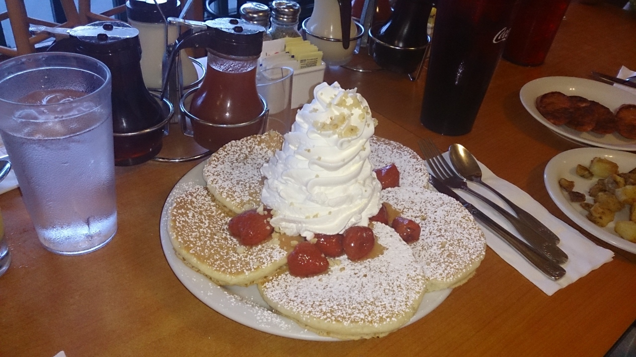 8月8日に5人で行きました。それほど待たずに入店できました。店員さんも明るくいい雰囲気でした。ストーロベリーパンケーキとホイップとパイナップルのフレンチトーストとポルトガルソーセージとフレンチポテトを注文しました。子供は、終盤パンケーキの甘さに飽きがきて、ソーセージとパンケーキを交互に食べていましたが、一人1枚ぐらいならとても美味しく頂けると思います。