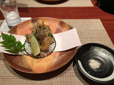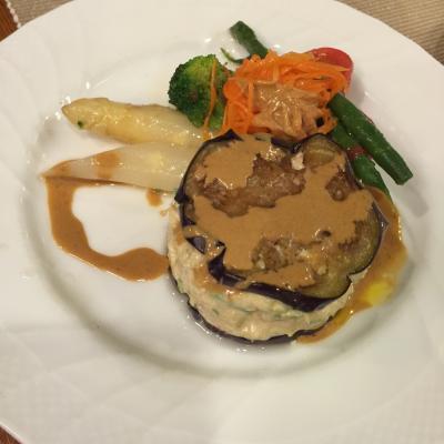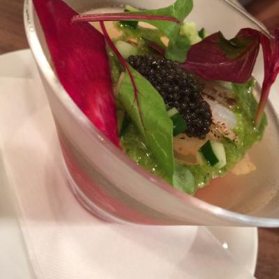 オーダーすると、大変お洒落な姿となって現れます。写真は、スズキのタルタルソース仕立て、テナガエビとトマトのジュレ、牛フィレ肉とフォアグラのロッシーニです。写真撮り忘れましたが、フォアグラと茸のスープが一押しで美味しかったです。