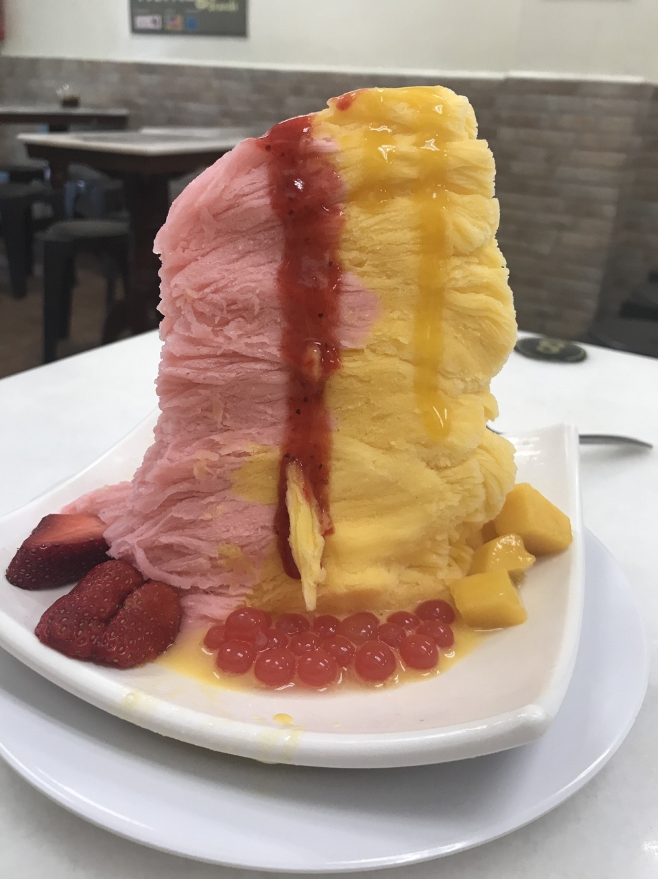 チャイナタウンに行ったのでせっかくなので食べたいと思い伺いました。店内は空いていて、クーラーが効いていて快適です。注文したのはイチゴとマンゴーのかき氷。6.5ドルです。イチゴは酸味があり、汗でベトベトになったカラダがシャキーンとします。マンゴーは甘みがなく少し残念でした。