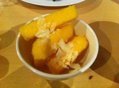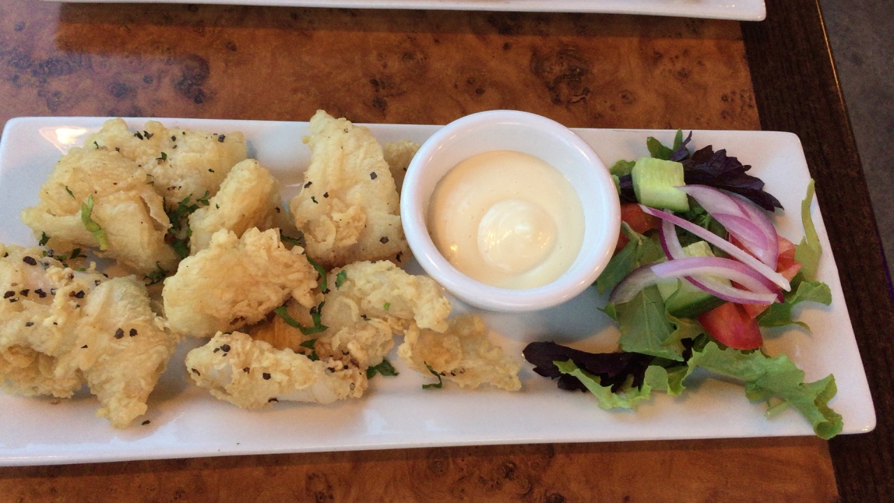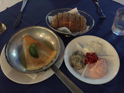 初めにパンとディップ3種、サガナキチーズが出てきて、その後にカラマリフライ。