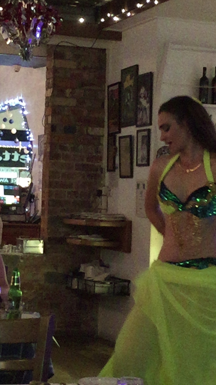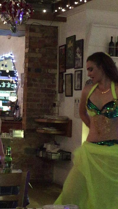 美味しく頂いていると、またまた店主が皿を割るのかと思いきや、奥から妖艶な踊り子さんが登場して音楽に合わせてベリーダンスを披露しながら各テーブルに回ってきます。