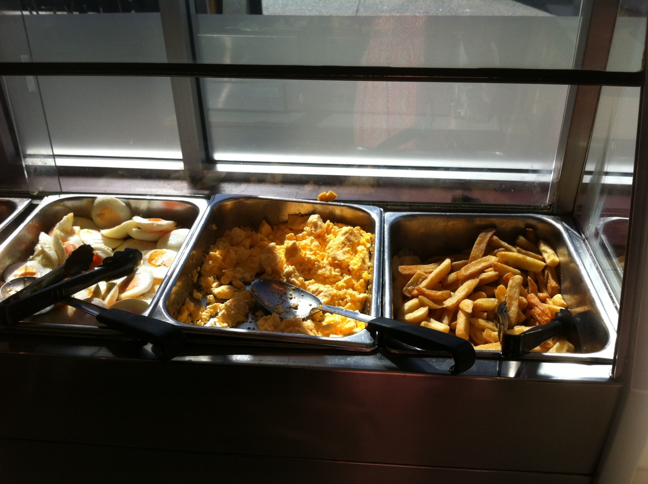 レジで朝食バッフェを頼むとお皿をくれますので、その皿に取りたい放題何度でもOKです。