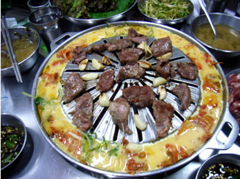 鉄板で肉を焼きながら、周りの窪みでキムチやニンニクを焼いていきます。