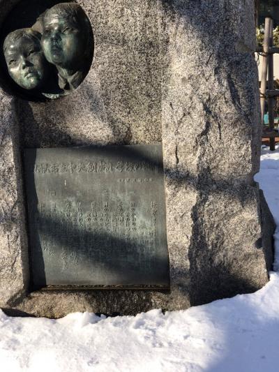 碑には、小さな子供2人の顔と右上には当時の「校章」と校歌のレリーフがあります。