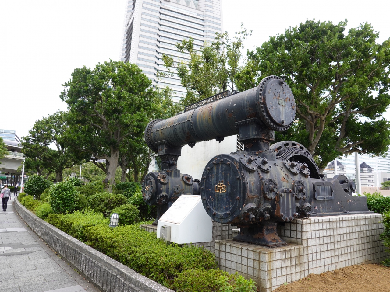 日本丸メモリアルパークの南端近くの植え込みに巨大なエアコンプレッサーが展示されています。こちらは100年以上も前に日本の会社がアメリカから購入したものということです。塗装のはげ方などもリアルで、大きく、見た目にもインパクトのある史跡だと感じました。