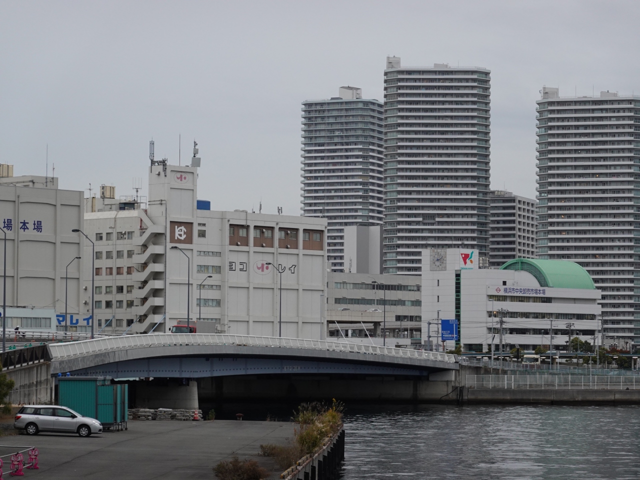 「みなとみらい橋」は、観光客にも親しみの深い「みなとみらい大橋」と異なり、やや地味な印象のある橋です。みなとみらい地区と中央卸売市場を結んでいますが、交通量は少なめです。橋の手前と向うでは周囲の光景が一変するのが興味深いです。