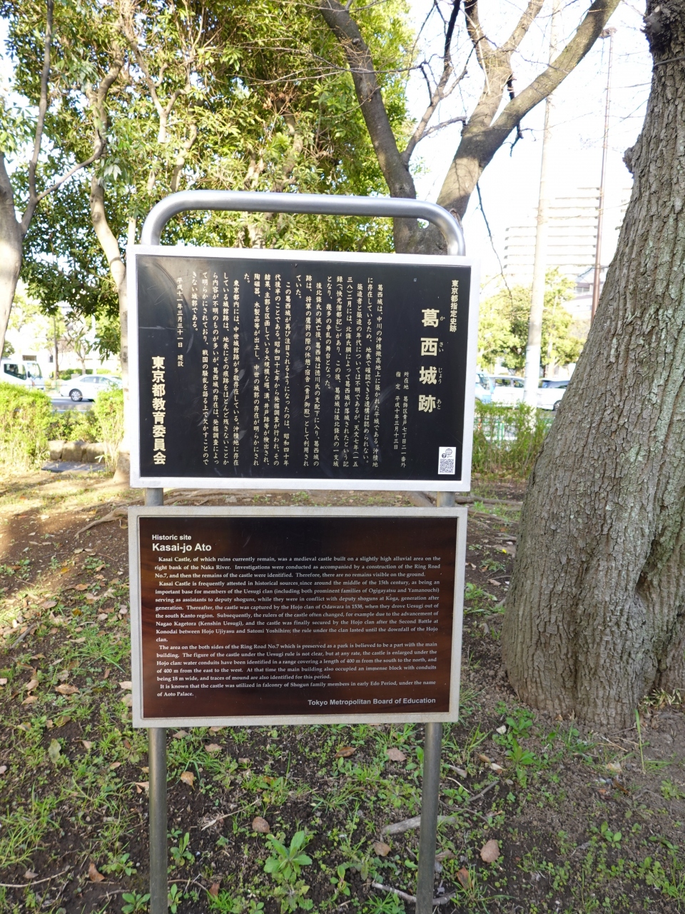 葛西城祉は、葛飾区青戸7丁目の一画、環状7号線を挟んで東西にまたがるエリアです。この一帯は「御殿山公園」と「葛西城址公園」という二つの公園として整備されており、史跡が点在していますが、そもそもこんな場所にお城があったというのが驚きです。