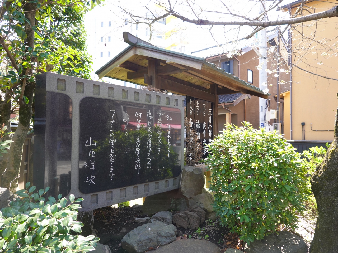 「映画の碑」は柴又駅から帝釈天方向に歩き、参道の入口に差し掛かったところにあります。映画のフィルムを象った石碑で、黒い御影石の部分に山田洋次監督の直筆の文字が刻まれています。晴れた日は黒い部分に周囲の景色が反射するので写真を撮りにくいです。