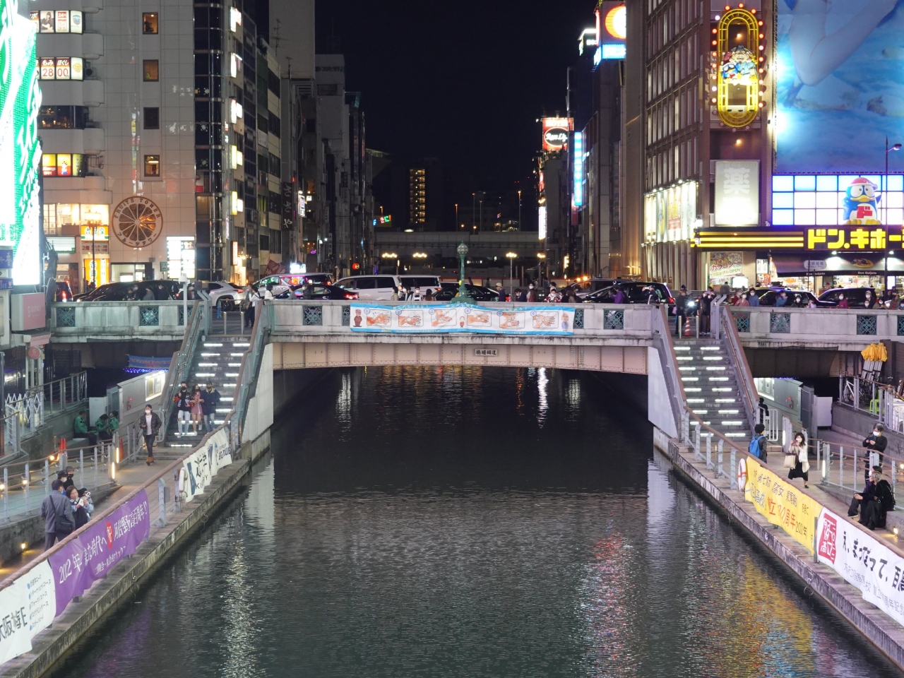 11月上旬の土曜日、イルミネーションも始まり、道頓堀橋は人も車も多く活気にあふれており、コロナ禍を忘れさせるような光景でした。道頓堀はこの橋の西と東で雰囲気が大きく変わります。西へ向かうと一挙に落ち着いた雰囲気になり、夜景を楽しみながらのリバーウォークがお薦めです。