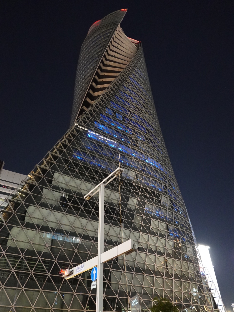 「モード学園スパイラルタワーズ」は、「名駅通」「太閤通」という2本の大通りが交差する場所にあります。再開発プロジェクトによって2008年に誕生したビルで、何と言ってもらせん状の高層タワーという奇抜な外観が目を引きます。今回は夜に訪れましたが、ビル頭頂部は赤く、真ん中部分は青く輝き、近未来の建築を見るような印象がありました。
