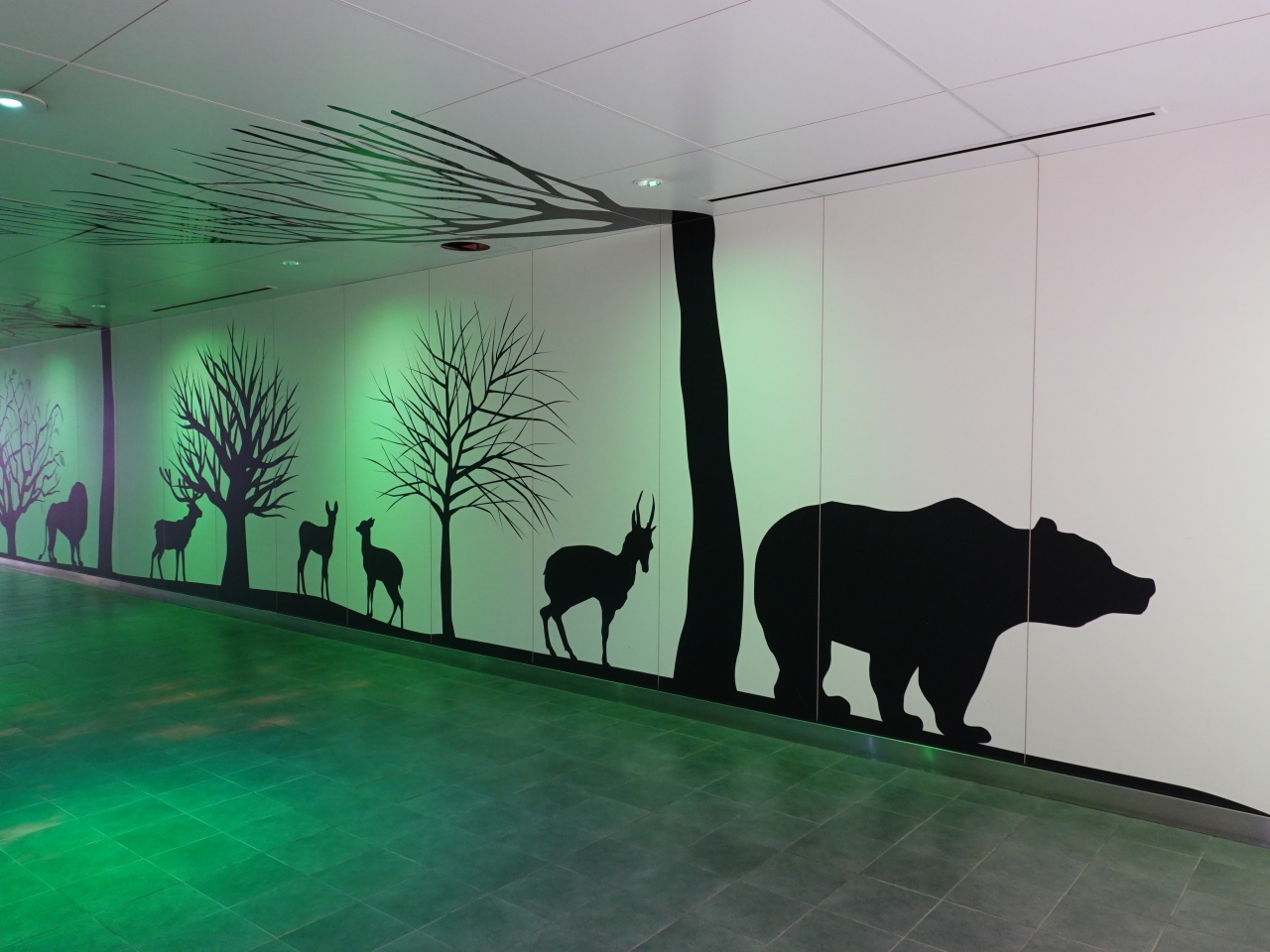 「ルーセントアベニュー」は、名古屋駅地下街からルーセントタワーに向かって北に延びる約290メートルの地下通路です。壁や天井に、動物や鳥、蝶などのシルエットが描かれ、様々な色の光で照らされています。日曜日の夜ですが、行き交う人はほとんどおらず、作品や光景を堪能することが出来ました。