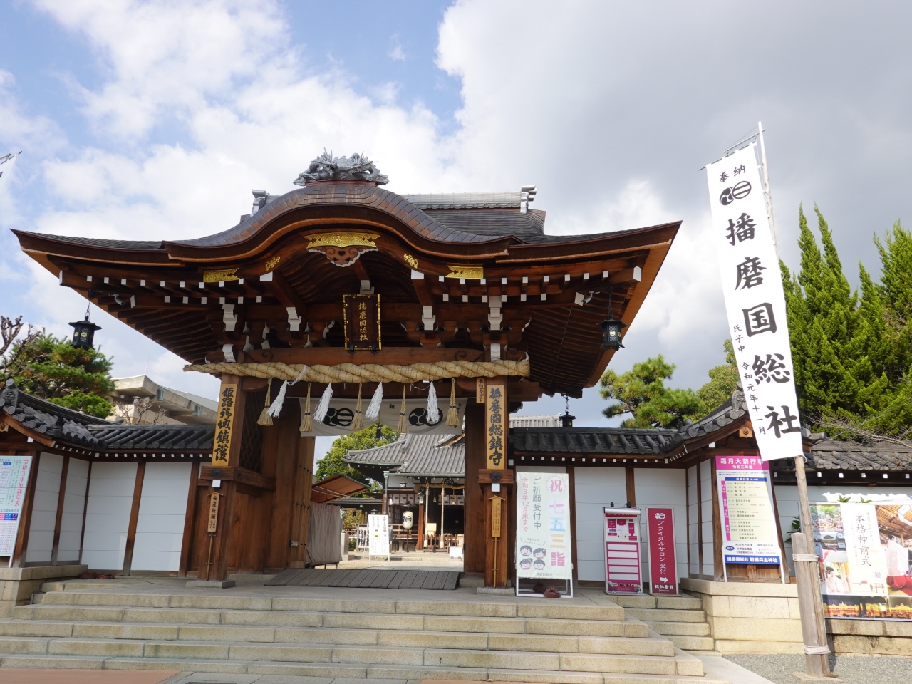 播磨国総社は、姫路城にもほど近い総社本町にあります。境内の西側を走る県道518号線沿いに朱色が鮮やかな「総社門」がありますが、その大きさとは対照的に、境内には大小さまざまな社がたくさんあります。寺社仏閣に関心の深い方にはとても興味深いスポットだと思いました。