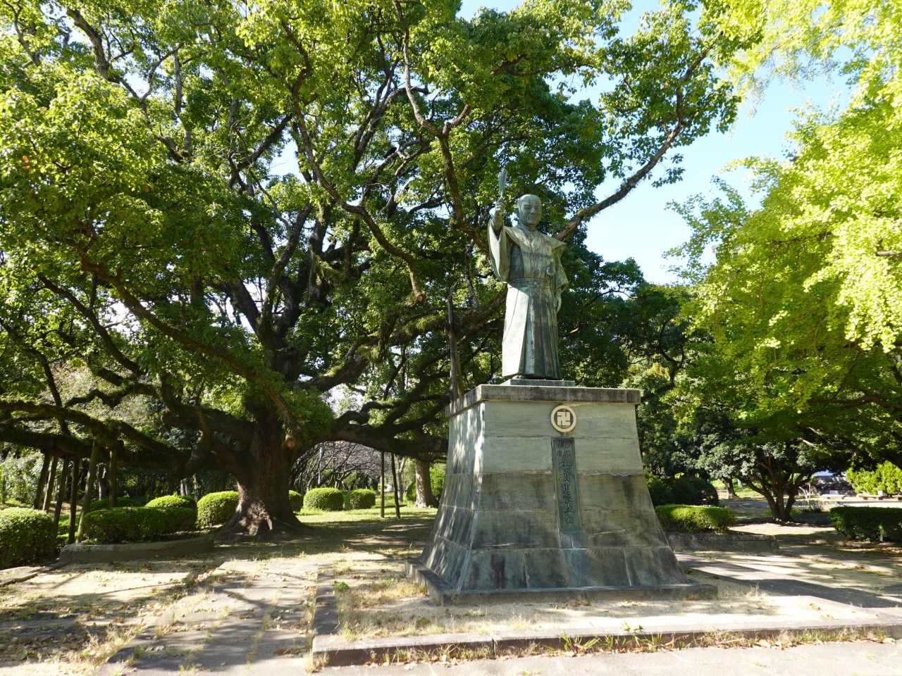 蜂須賀家政は、戦国時代から江戸時代前期にかけて活躍した武将であり大名で、徳島城主だった人物です。その銅像が徳島中央公園の一画にあります。訪れたのは11月初頭ですが、銅像の周囲を取り囲む木々の緑が力強く、蜂須賀家政公の威厳を高めているように感じました。