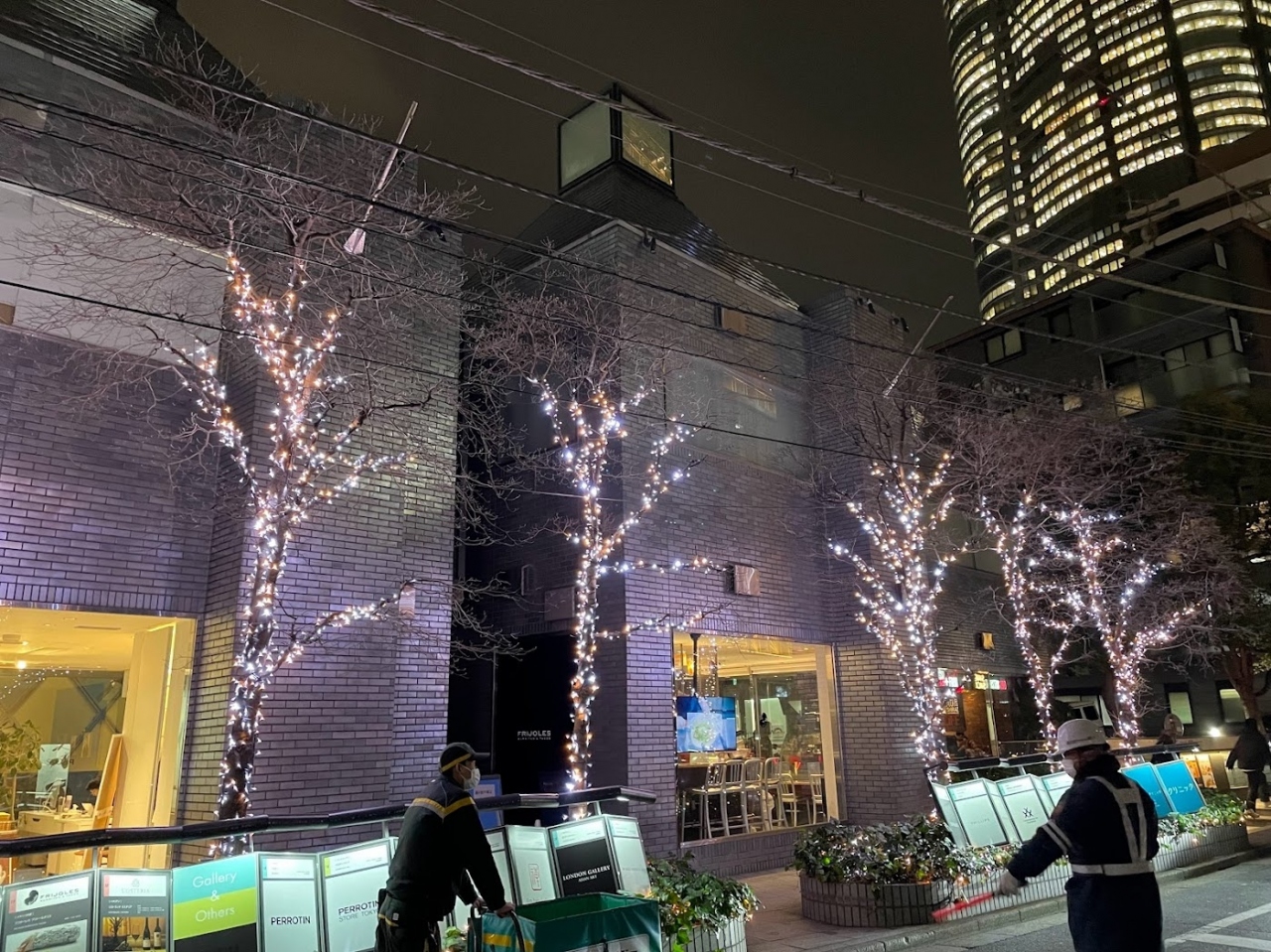 ピラミデビルは、六本木通りの一本南側を並行して走る裏通り沿いにあります。久々に足を運んだところ、建物前の街路樹や花壇にイルミネーションが設置され、お洒落な雰囲気でした。