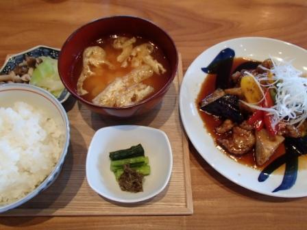「彩り野菜と信州豚の黒酢炒め」は、炊きたてご飯と味噌汁、小鉢に漬物と一緒に供されました。