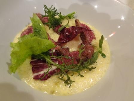 前菜は、ルッコラを中心とした野菜、焼きリゾット、フリットの組み合わせなのですが、この品は大半の日本人の心を射止めるだろうと感じさせられる逸品。食べ終えてしまうのが惜しいくらいに美味しかったです。