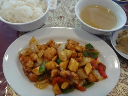 待つこと約10分で、メインの料理とご飯、スープ、サラダと点心ひとつがお盆にのって登場しました。
