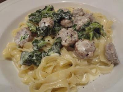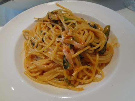 パスタはガーリック風味が絶妙のトマトソースがふんだんにかけられたひと品。ホウレン草もたっぷりでこれがまた美味しい!