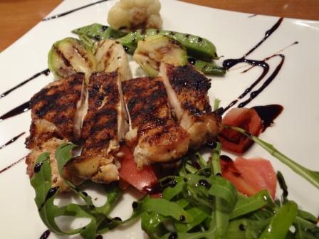 今日一番の圧巻は、シェフが担当していたメインの一皿です。私は鶏肉のローストを選んだのですが、パリっと焦げ目のついた鶏肉がバルサミコソースで仕立てられ、付け合せとして、芽キャベツ、フルーツトマト、ルッコラ、ブロッコリー、インゲンなど多種の野菜がふんだんに添えられていました。