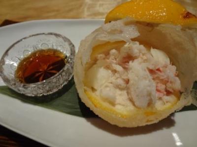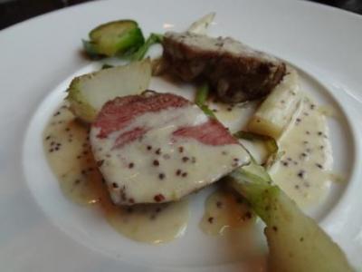 前菜がタラバ蟹とクスクス、フォワグラ料理の2皿。フォワグラ料理は、フォワグラ自体の塩分と、添えられたバルサミコソースの甘みが絶妙なひと皿でした。