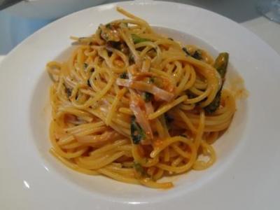 お店の方にお聞きすると、昼に手打ちパスタがラインアップされる事はないそうです。ランチタイムのOLさん向けに、凝縮された時間でたくさんの料理を捌かねばならないため、乾麺の種類を茹で時間の短いスパゲティーニに統一しているのかな?と推測しました。