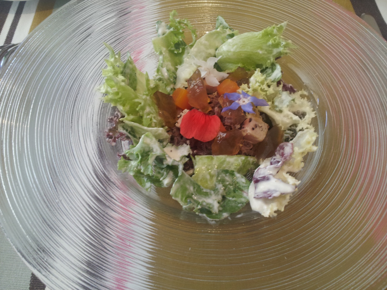 前菜は「牛テール肉とじゃが芋のサラダ仕立て、ホースラディッシュのソース、フォアグラ添え」を、メインは「本日の鮮魚(イトヨリ)のポワレ、じゃが芋のモワルー・アニス風味、ブイヤベースのジュ」を、デザートは「レアチーズケーキ フランボワーズ風味」をセレクトしました。