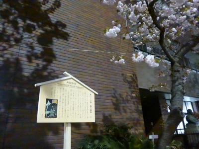 「置いてけ堀 御竹蔵跡」の高札は、清澄通り沿いに設置されています。4月の上旬で高札の周囲には桜の花が見られました。高札にプリントされた浮世絵と美しい夜桜がすばらしいコラボレーションを作り上げていると感じました。